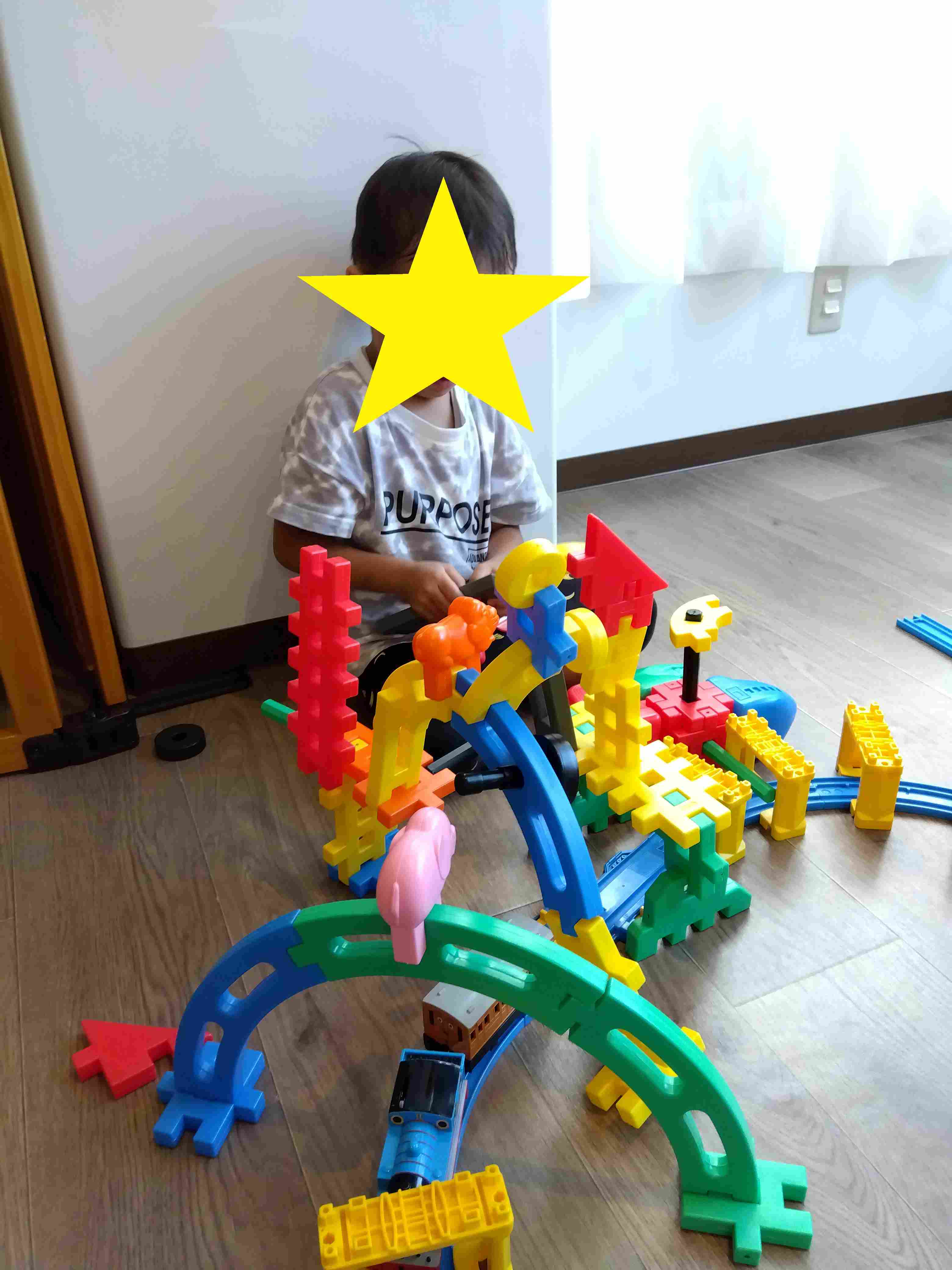 完成した後は乗り物に乗って、部屋中を移動して楽しんでいます。