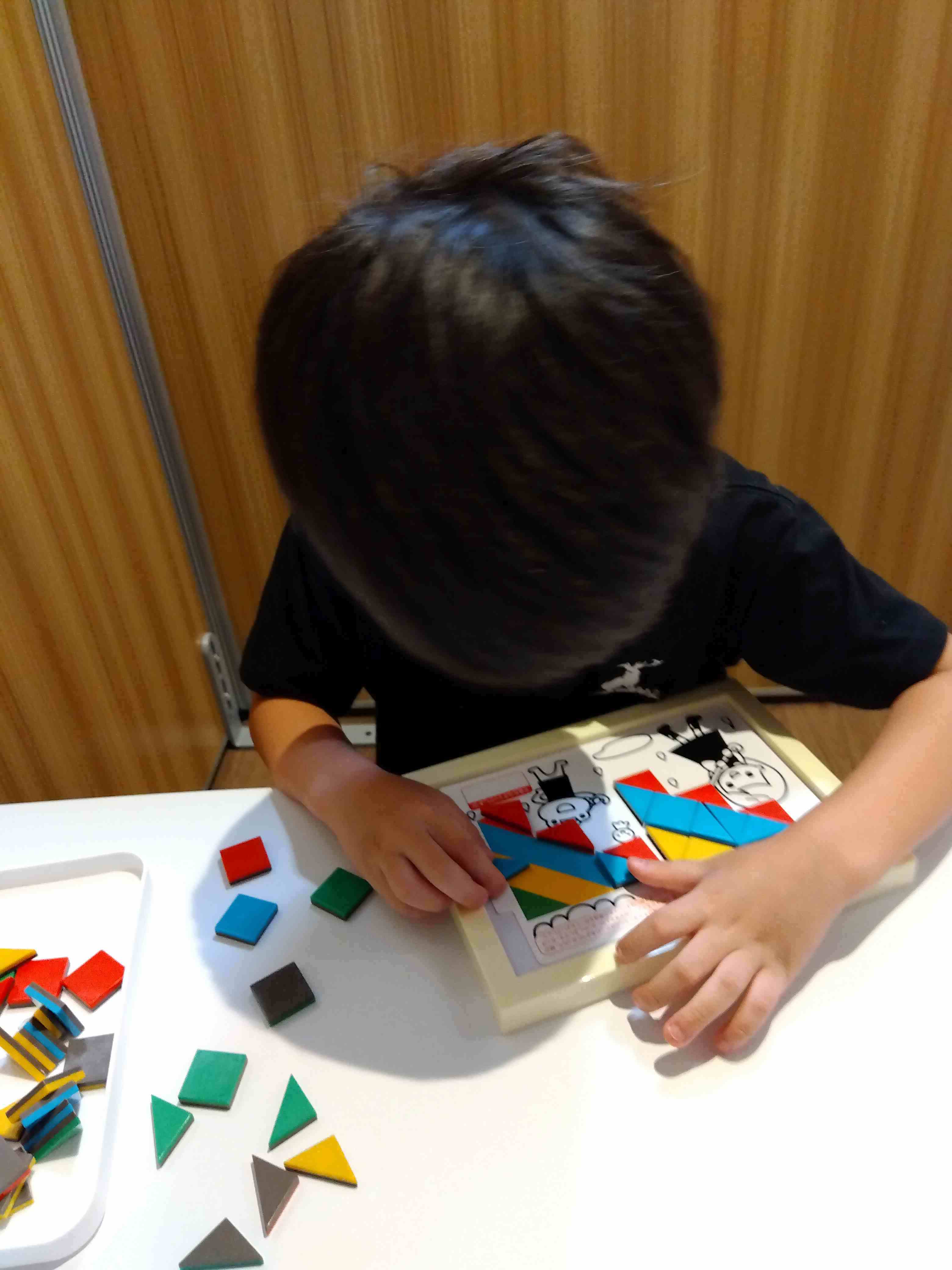 この写真のお子さんが取り組んでいるのは、三角形、四角形のピースを組み合わせて、いろいろな図柄を作ることのできるパズルです。